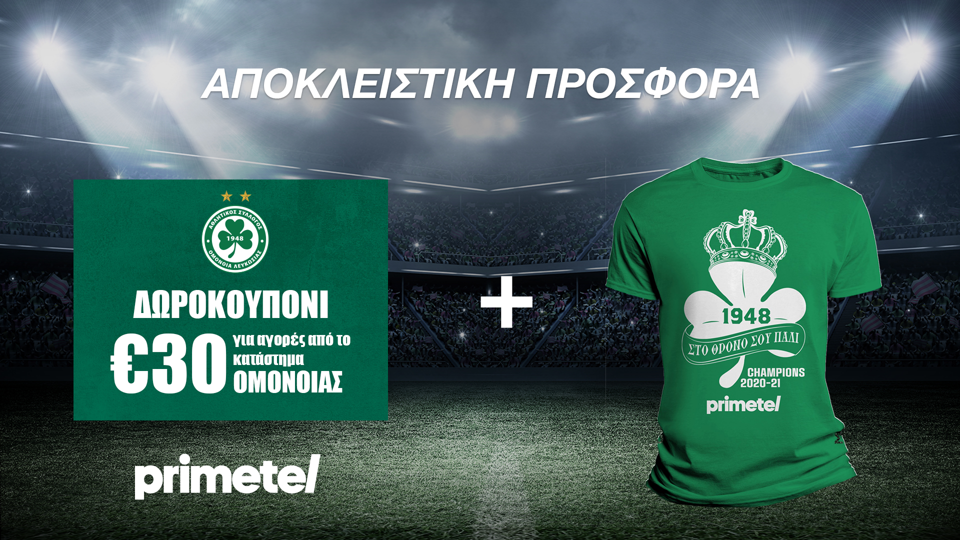 Κάθε νέος ή υφιστάμενος συνδρομητής κινητής που μεταφέρει τον αριθμό του σε πρόγραμμα κινητής Primetel GIGA Smart ή GIGA Unlimited ή ανανεώνοντας το συμβόλαιό του, θα κερδίζει δωροεπιταγή αξίας 30 ευρώ που θα εξαργυρώνει στα Green Boutique της Ομόνοιας αλλά και μια συλλεκτική επετειακή φανέλα για την κατάκτηση του πρωταθλήματος!