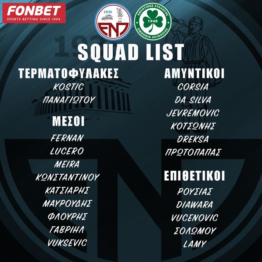 Η ΕΝΠ ανακοίνωσε την αποστολή της για τον σημερινό αγώνα κόντρα στην Ομόνοια (19:00).