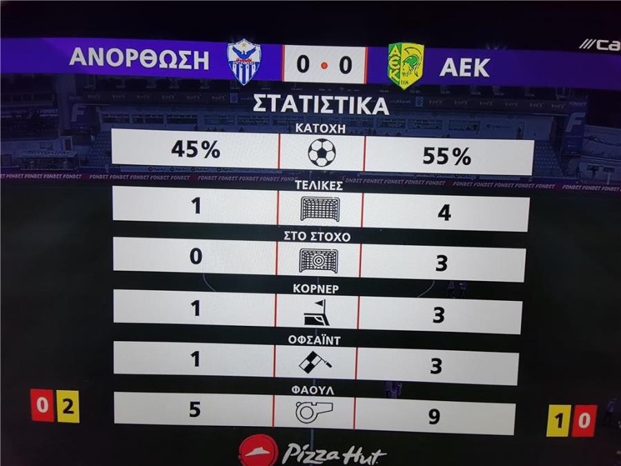 Σε ένα ισορροπημένο α' ημίχρονο Ανόρθωση και ΑΕΚ δεν σκόραραν και κυμάνθηκαν σε μέτρια επίπεδα απόδοσης. Η ΑΕΚ μπήκε πιο επιθετικά στο ματς, ενώ στο 21' ο Γκιούρτσο αστόχησε σε πέναλτι που υποδείχθηκε μέσω onfield review για χέρι του Αντωνιάδη, με τον Λόρια να... ψαρεύει τον Μαυγιάρο. Οι γηπεδούχοι επιδίωξαν αρχικά να καταστρέψουν το σχέδιο του Όλτρα, ενώ επιθετικά απείλησαν ελάχιστα την εστία του Πίριτς.