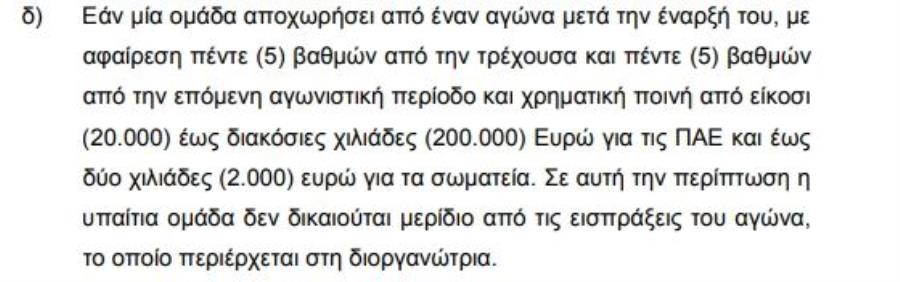 "Εάν μία ομάδα αποχωρήσει από έναν αγώνα μετά την έναρξή του, με αφαίρεση πέντε (5) βαθμών από την τρέχουσα και πέντε (5) βαθμών από την επόμενη αγωνιστική περίοδο και χρηματική ποινή από είκοσι (20.000) έως διακόσιες χιλιάδες (200.000) Ευρώ για τις ΠΑΕ και έως δύο χιλιάδες (2.000) ευρώ για τα σωματεία. Σε αυτή την περίπτωση, η υπαίτια ομάδα δεν δικαιούται μερίδιο από τις εισπράξεις του αγώνα, το οποίο περιέρχεται στη διοργανώτρια".