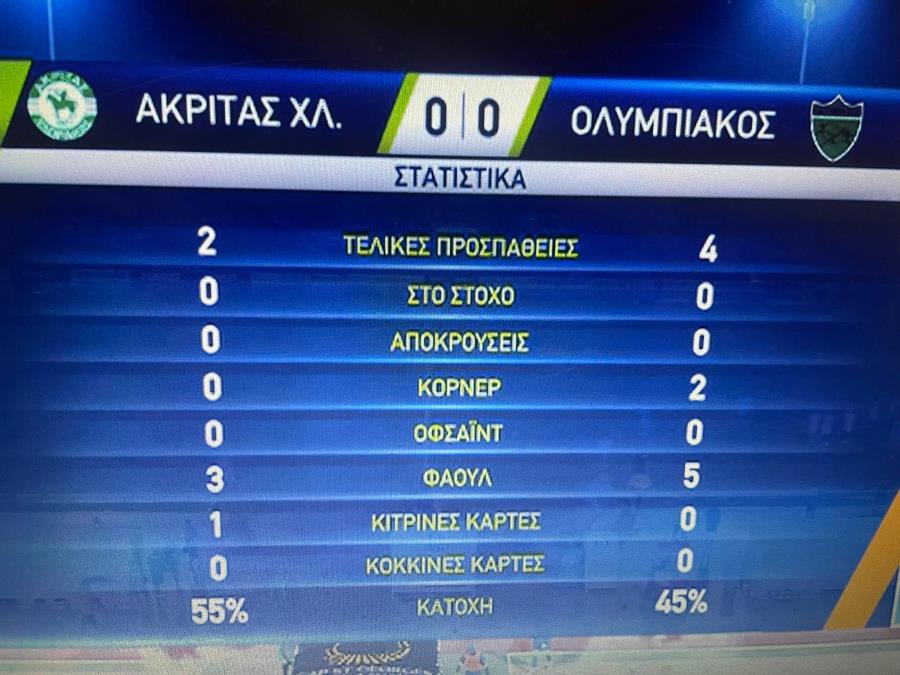 Χωρίς ιδιαίτερο ενδιαφέρον και ευκαιρίες εξελίχθηκε το πρώτο ημίχρονο στο «Στέλιος Κυριακίδης» ανάμεσα στον Ακρίτα και τον Ολυμπιακό. Οι δύο ομάδες μοίρασαν το πρώτο μισό, αφού αγωνιστικά ήταν αρκετά ισοδύναμες, κάτι που τις έστειλε στα αποδυτήρια με το ισόπαλο 0-0.