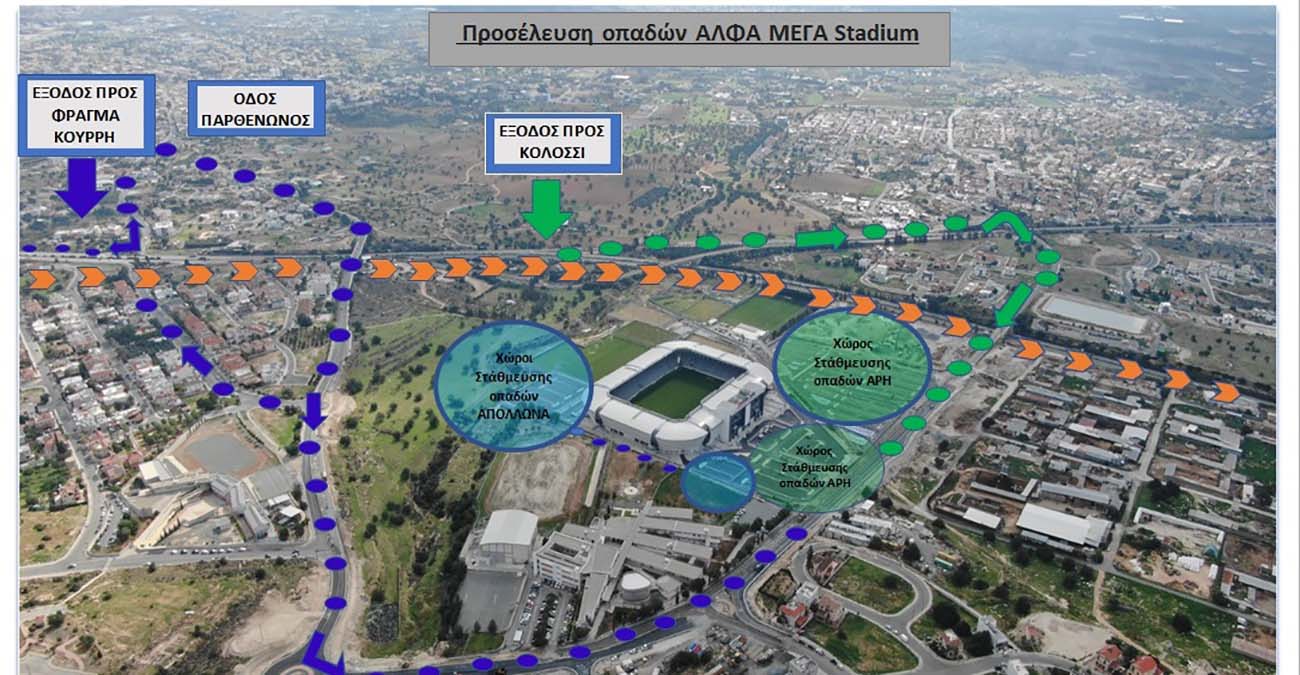Για την ομαλή προσέλευση και αποχώρηση των οπαδών του ΑΠΟΛΛΩΝΑ προς και από το στάδιο, καλούνται να κατευθυνθούν προς ΑΛΦΑΜΕΓΑ Stadium, δια μέσου του αυτοκινητόδρομου {Α6} προς Πάφο, έξοδο προς φράγμα Κούρρη και στη συνέχεια μέσω της οδού Παρθενώνος (1ο στρίψιμο δεξιά). Ακολούθως από τη 1η έξοδο {αριστερά} του νέου κυκλικού κόμβου, κατεύθυνση προς το γήπεδο. Οι φίλαθλοι του ΑΠΟΛΛΩΝΑ μπορούν να σταθμεύσουν στους προκαθορισμένους χώρους του γηπέδου για τους φιλοξενούμενους.