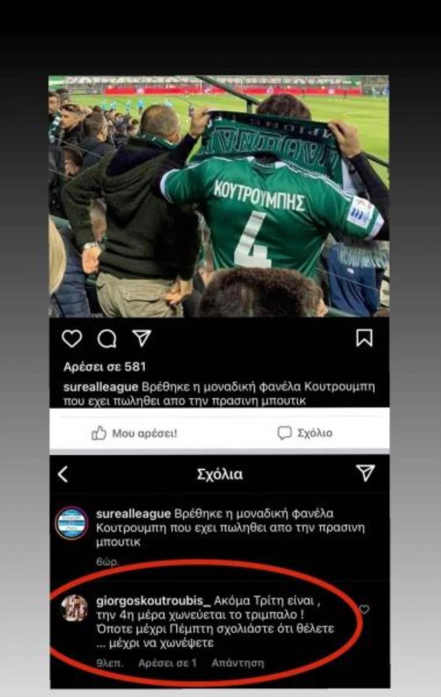 Αυτό φυσικά προκάλεσε την οργή των φίλων του τριφυλλιού, με τον Γιώργο Κουτρουμπή να διαγράφει στη συνέχεια το σχόλιο.