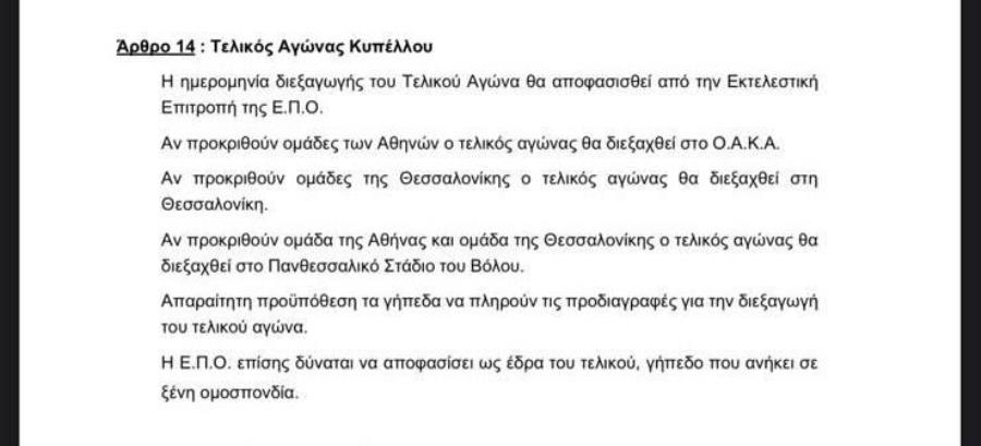 Πρόκειται άλλωστε για κάτι που ορίζει και η προκήρυξη του Κυπέλλου, αναφέροντας χαρακτηριστικά πως: «Η ΕΠΟ επίσης δύναται να αποφασίσει ως έδρα του τελικού, γήπεδο που ανήκει σε ξένη ομοσπονδία».