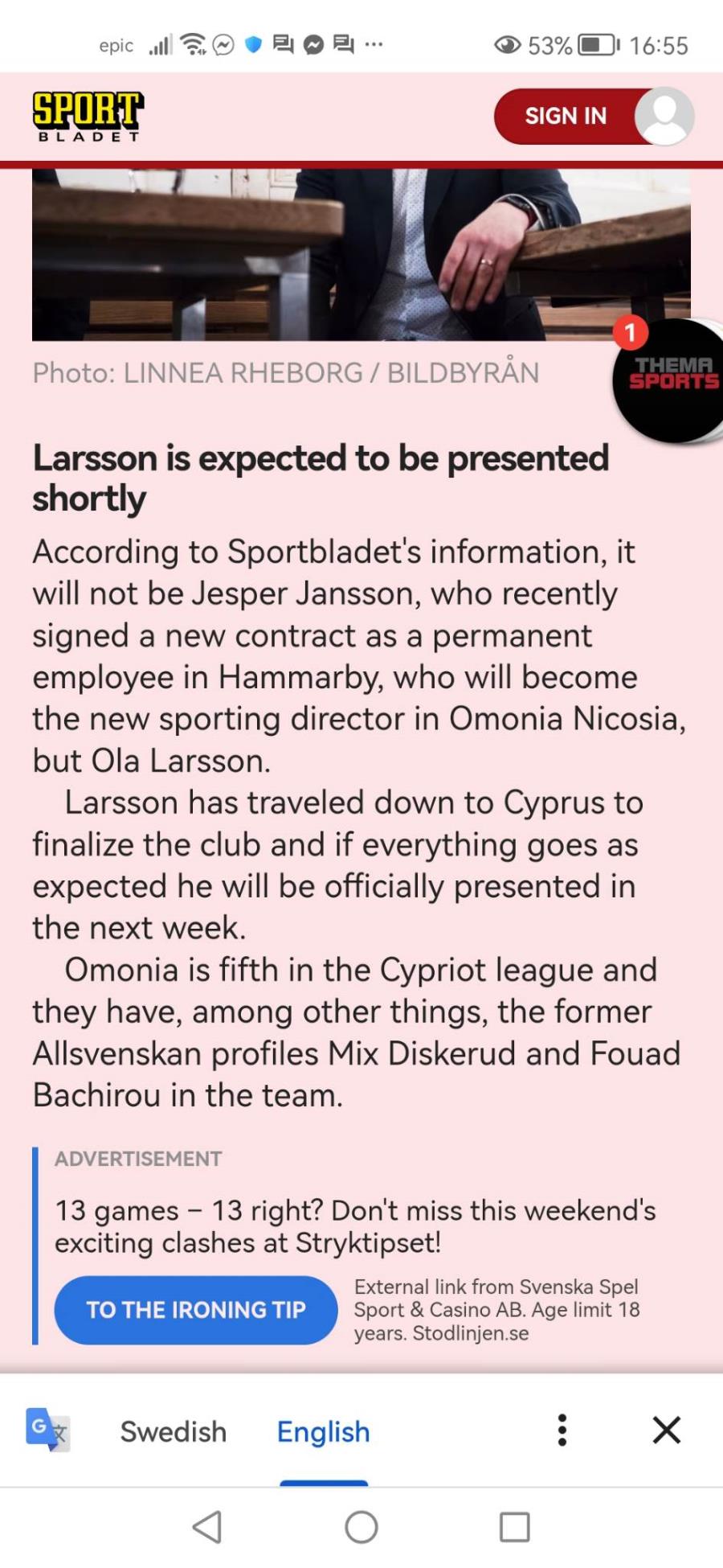 Σύμφωνα με το δημοσίευμα στην σκανδιναβική χώρα, ο Λάρσον θα είναι ο νέος τεχνικός διευθυντής της Ομόνοιας και όχι ο Γέσπερ Γιάνσον, το όνομα του οποίου επίσης συνδέθηκε με τους πράσινους.