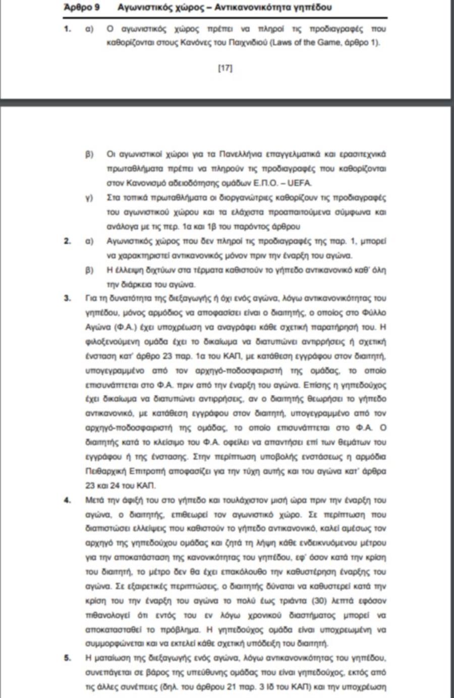 Δείτε τι αναφέρει ο ΚΑΠ στο άρθρο 9 για τη μη διεξαγωγή αγώνα όταν αυτή συμβαίνει λόγω αντικανονικότητας του γηπέδου.