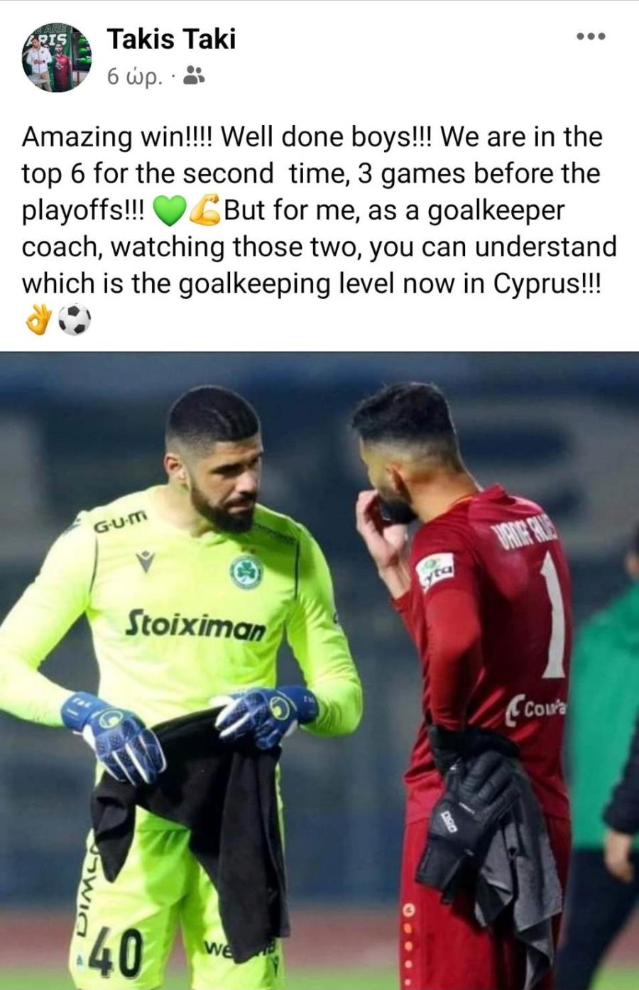 «Φανταστική νίκη! Μπράβο παιδιά! Είμαστε στην εξάδα για δεύτερη φορά, τρία ματς πριν τα πλέι οφ! Αλλά για μένα, ως προπονητής τερματοφυλάκων, το να βλέπω αυτούς τους δύο καταλαβαίνω ποιο είναι το επίπεδο των τερματοφυλάκων στην Κύπρο τώρα».