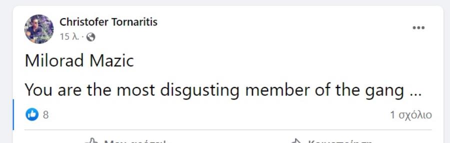 «Μίλοραντ Μάζιτς, είσαι το πιο αηδιαστικό μέλος της συμμορίας», έγραψε ο κ. Τορναρίτης.