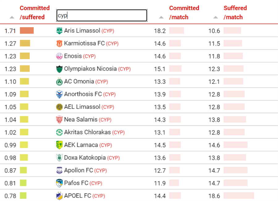 Ο πίνακας με τις ομάδες που κέρδισαν τα περισσότερα φάουλ στην Κύπρο: