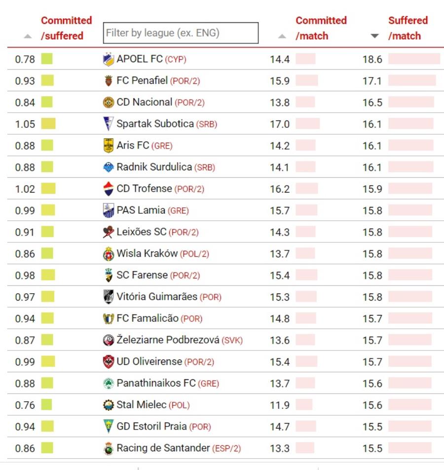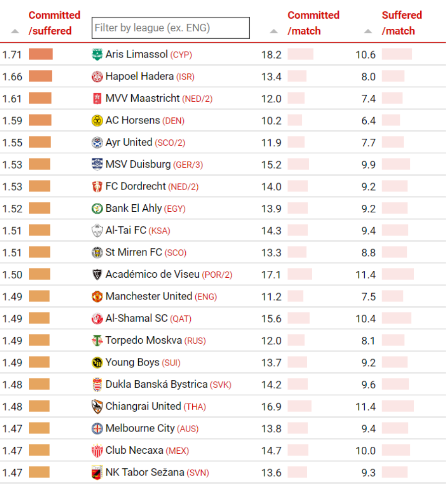 Η 410η εβδομαδιαία ανάρτηση του CIES Football Observatory (Ποδοσφαιρικό Παρατηρητήριο) κατατάσσει τις ομάδες σε 52 πρωταθλήματα σε όλο τον κόσμο σύμφωνα με την αναλογία της τρέχουσας σεζόν μεταξύ των φάουλ που έκαναν και που υπέστησαν. Στα πέντε μεγάλα ευρωπαϊκά πρωταθλήματα, σύμφωνα με τα στοιχεία InStat/WyScout, οι τιμές κυμαίνονται από την αναλογία 1,49 για τη Μάντσεστερ Γιουνάιτεντ έως 0,68 για τη Ρεάλ Μαδρίτης.