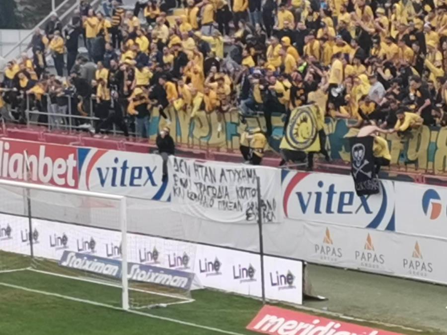 Συγκεκριμένα, στο πανό των Σαλαμιναίων αναγράφεται το μήνυμα: «Δεν ηταν ατυχημα ηταν εγκλημα». ενώ το μήνυμα στο πανό των ΑΕΛιστών αναφέρει: «Δεν ήταν ατύχημα είναι τραγωδία, Κράτος και κεφάλαιο πραξαν δολοφονία».