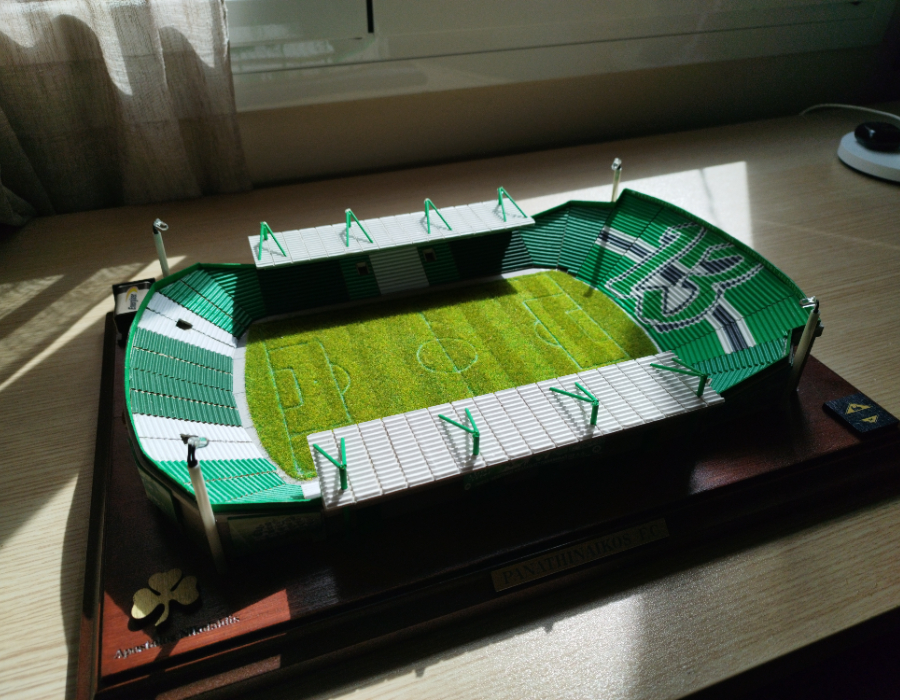 Παίρνει αρκετό καιρό το σχέδιο για να γίνει. Μετά ξεκινάω με τη βάση, η οποία είναι διαφορετική κάθε φορά. Ακολουθεί το γρασίδι, πρώτα ένα πιο απλό και μετά το συνθετικό, που είναι φουντωτό και δίχρωμο ώστε να φαίνεται σαν το πραγματικό. Οι κερκίδες γίνονται όλες στην αρχή. Έπειτα “ντύνεται” από πίσω και προστίθεται στο τέλος το στέγαστρο, αν υπάρχει σε κάποιο γήπεδο», αναφέρει χαρακτηριστικά ο κ. Κτίστης σχετικά με τα βήματα που ακολουθεί.