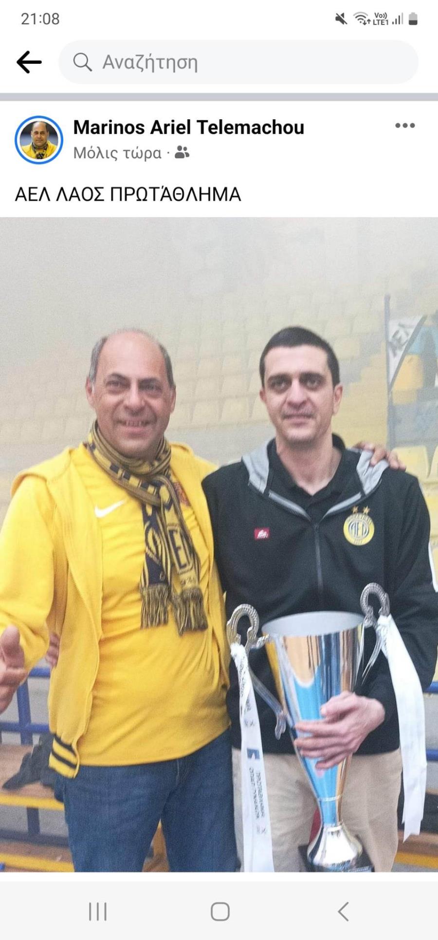 Το πανηγύρισε με την ψυχή του ο Γιώργος και σίγουρα δεν θα χαλούσε το χατίρι στον γνωστό φίλαθλο της ΑΕΛ, Μαρίνο Τηλεμάχου (πιο γνωστό Μαρίνο Αριέλ), για μία αναμνηστική φωτογραφία.