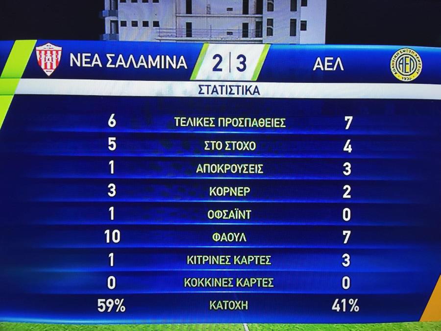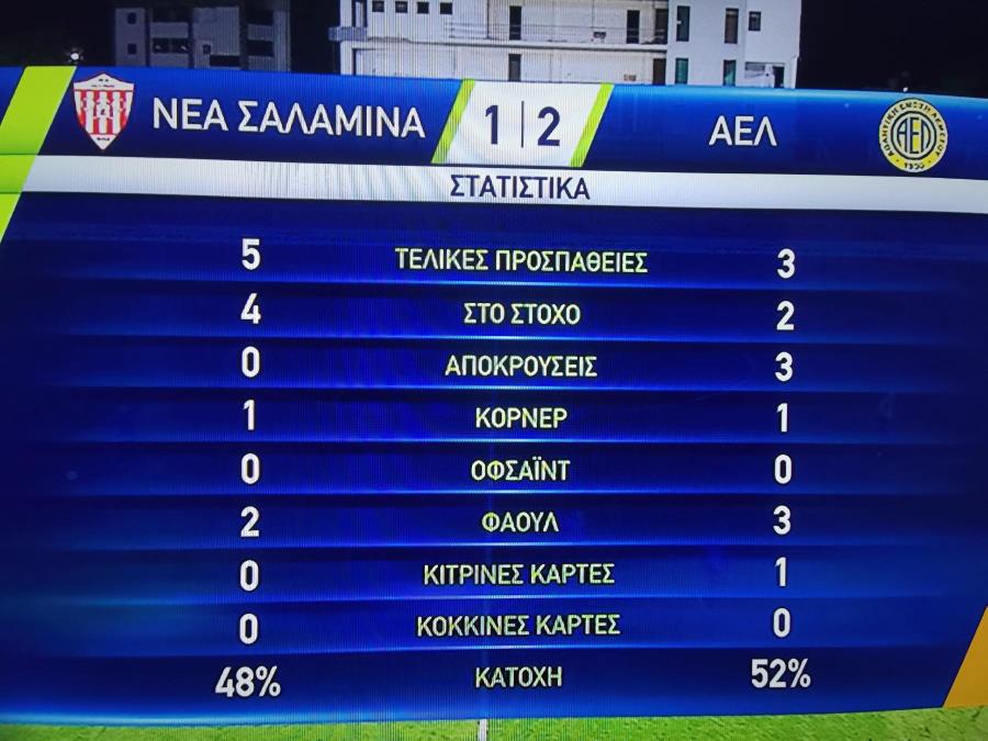 Η ΑΕΛ νίκησε 2-3 (Ντορεγκαράι 21', 79'/ Μιραλάς 20' πεν., 38', Ρομό 46') την Νέα Σαλαμίνα στο «Αμμόχωστος» για τη 2η αγωνιστική στο Β' γκρουπ. 13η ήττα για την Νέα Σαλαμίνα που παρέμεινε στους 41 βαθμούς, 11η νίκη για την ΑΕΛ που ανέβηκε στους 38 βαθμούς.