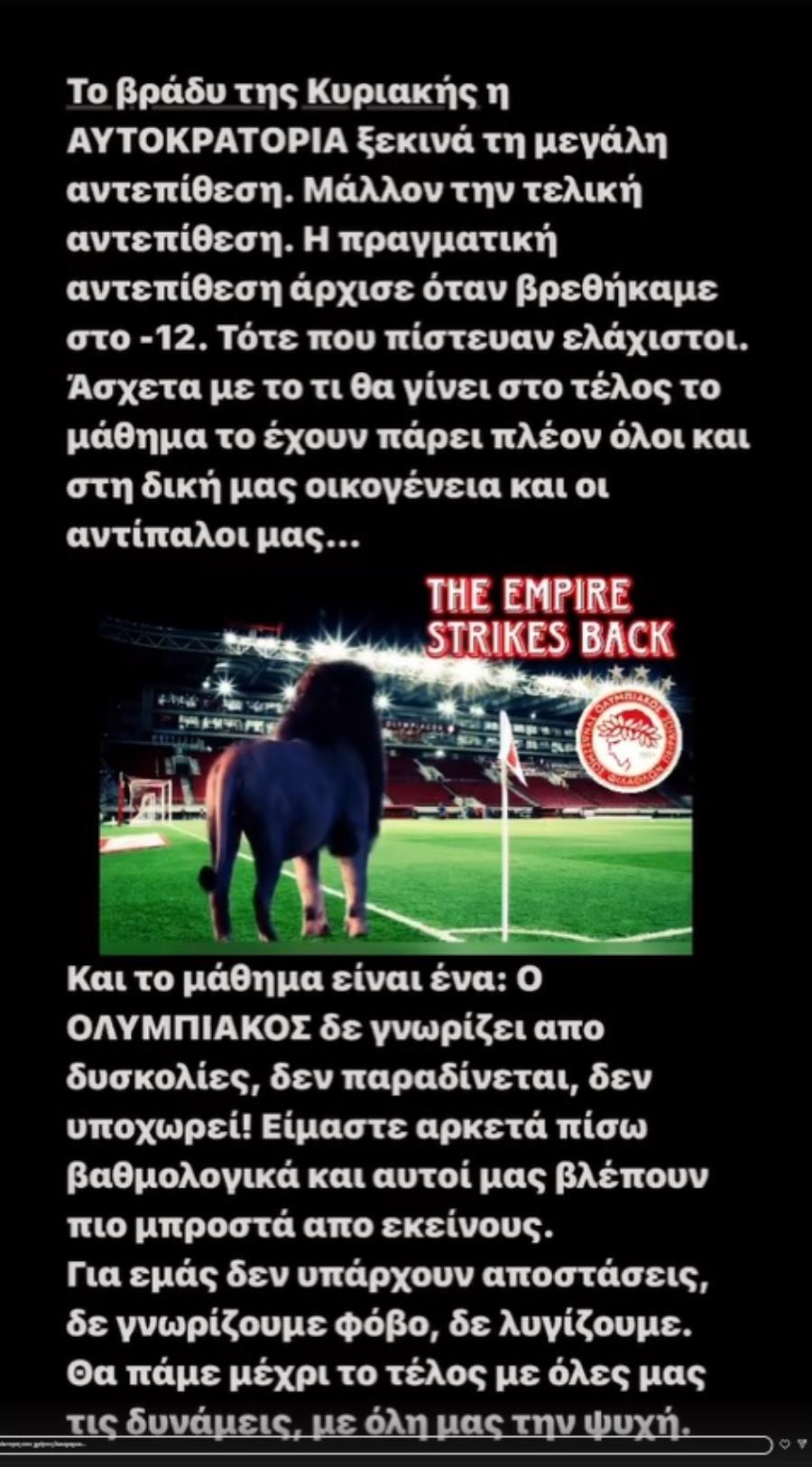«Το βράδυ της Κυριακής η αυτοκρατορία ξεκινά τη μεγάλη αντεπίθεση. Μάλλον την τελική αντεπίθεση. Η πραγματική αντεπίθεση άρχισε όταν βρεθήκαμε στο -12. Τότε που πίστευαν ελάχιστοι. Άσχετα με το τι θα γίνει στο τέλος, το μάθημα το έχουν πάρει πλέον όλοι. Και στη δική μας οικογένεια, και οι αντίπαλοί μας. Και το μάθημα είναι ένα: ο Ολυμπιακός δεν γνωρίζει από δυσκολίες, δεν παραδίνεται, δεν υποχωρεί! Είμαστε αρκετά πίσω στη βαθμολογία και αυτοί μας βλέπουν πιο μπροστά από εκείνους. Για εμάς δεν υπάρχουν αποστάσεις, δεν γνωρίζουμε φόβο, δεν λυγίζουμε. Θα πάμε μέχρι το τέλος με όλες μας τις δυνάμεις, με όλη μας την ψυχή», τονίζει.