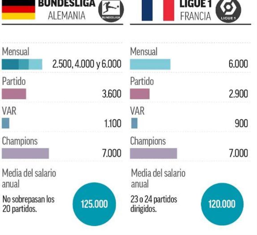 Η ισπανική εφημερίδα Marca έχει ένα ιδιαίτερα αποκαλυπτικό ρεπορτάζ σχετικά με τους μισθούς των διαιτητών στα έξι μεγάλα ευρωπαϊκά πρωταθλήματα: Ισπανία, Αγγλία, Ιταλία, Γερμανία, Γαλλία και Πορτογαλία.