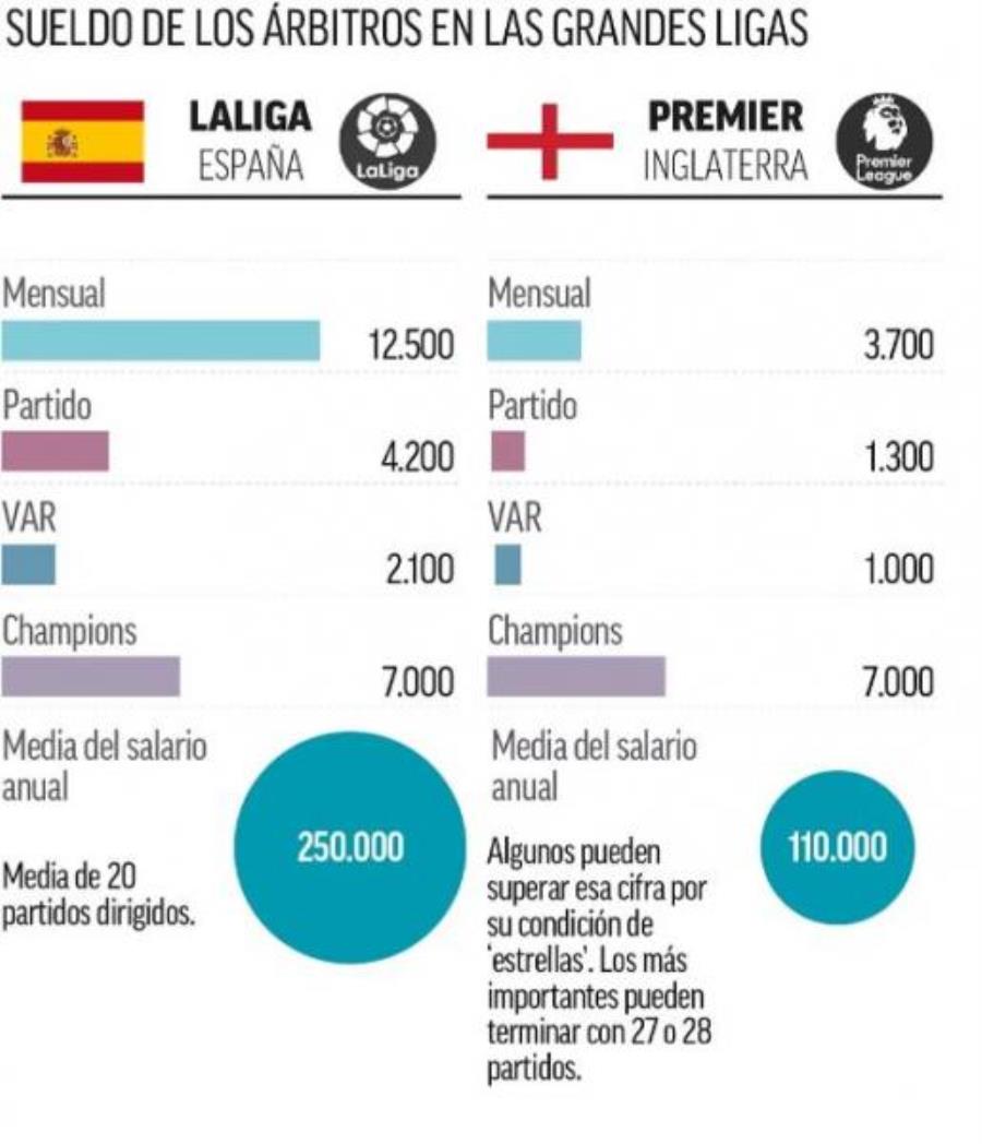 Σύμφωνα με τα στοιχεία που δημοσιεύονται, οι Ισπανοί διαιτητές είναι αυτοί που αμείβονται καλύτεροι, με εξαιρετικά υψηλούς μισθούς (σχεδόν τους διπλάσιους σε σχέση με τους συναδέλφους τους στην Πρέμιερ Λιγκ), καθώς μάλιστα από τον Σεπτέμβριο του 2020 η διαιτησία στην χώρα της Ιβηρικής είναι επαγγελματική.