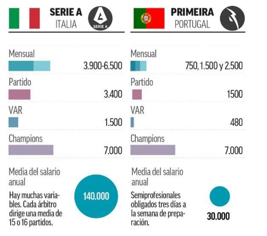 Μπορείτε να δείτε τους πίνακες με τις αναλυτικές απολαβές των διαιτητών σε Ισπανία, Αγγλία, Γερμανία, Γαλλία, Ιταλία και Πορτογαλία. Αναφέρονται οι μηνιαίες απολαβές, τα λεφτά που παίρνουν ανά αγώνα αν είναι πρώτοι ή στο VAR, οι μισθοί για το Τσάμπιονς Λιγκ και τα συνολικά ετήσια ποσά.