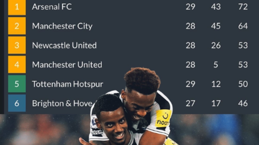 Έχουμε λοιπόν τη Νιούκαστλ των 53ων βαθμών, τη Μάντσεστερ Γιουνάιτεντ στην ισοβαθμία, με 28 παιχνίδια για κάθε μία από τις δύο, την Τότεναμ με 50 πόντους και ένα ματς περισσότερο και τη Μπράιτον των 27 ενενηνταλέπτων και των 46 βαθμών. Οι «γλάροι» έχουν ένα ματς λιγότερο από τη Λίβερπουλ και ένα τρίποντο παραπάνω, με την Άστον Βίλα να μεσολαβεί με 44 βαθμούς, αλλά και δύο παιχνίδια περισσότερα από το σύνολο του Ντε Τζέρμπι.