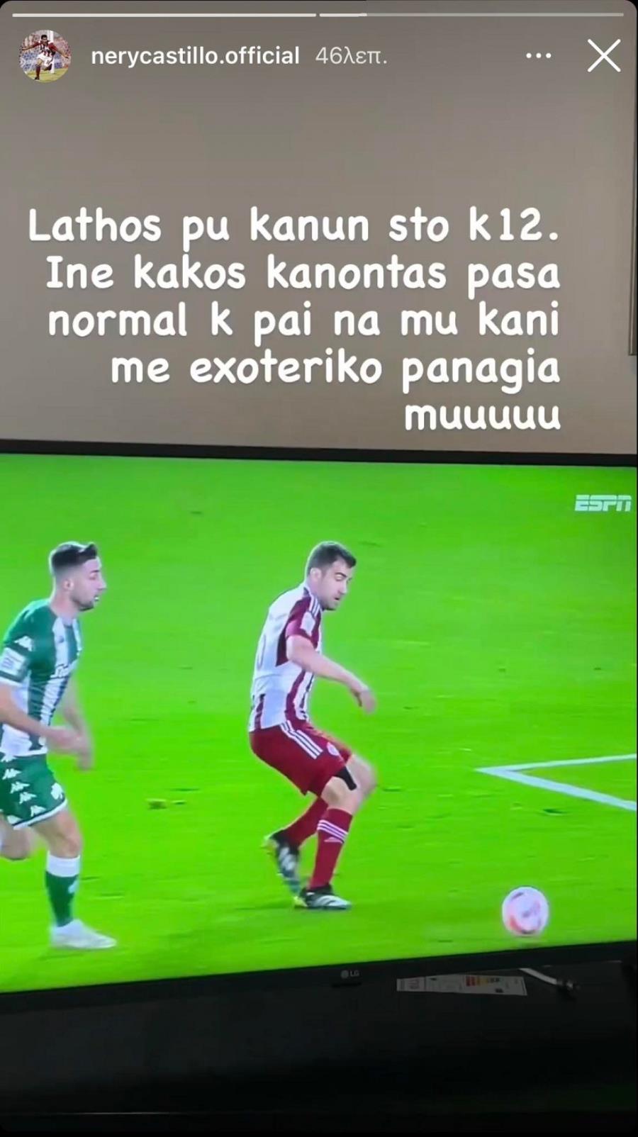 Ο Νέρι Καστίγιο ανέβασε story στα social media και ήταν καυστικός για την... γκάφα του Έλληνα στόπερ, γράφοντας: «Λάθος που κάνουν στο Κ12. Είναι κακός κάνοντας πάσα νορμάλ και πάει να μου κάνει με εξωτερικό, παναγιά μου».