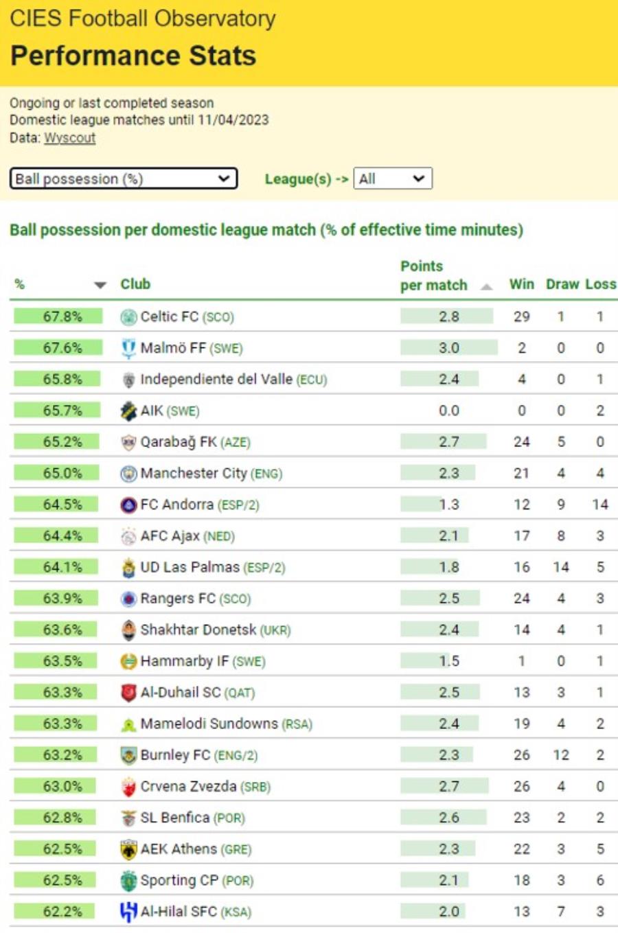 Την ικανότητα της «Ένωσης» με την μπάλα στα πόδια -για την ακρίβεια στην κατοχή και την κυκλοφορία της- ανέδειξε η λίστα που δημοσίευσε το «CIES Football Observatory».