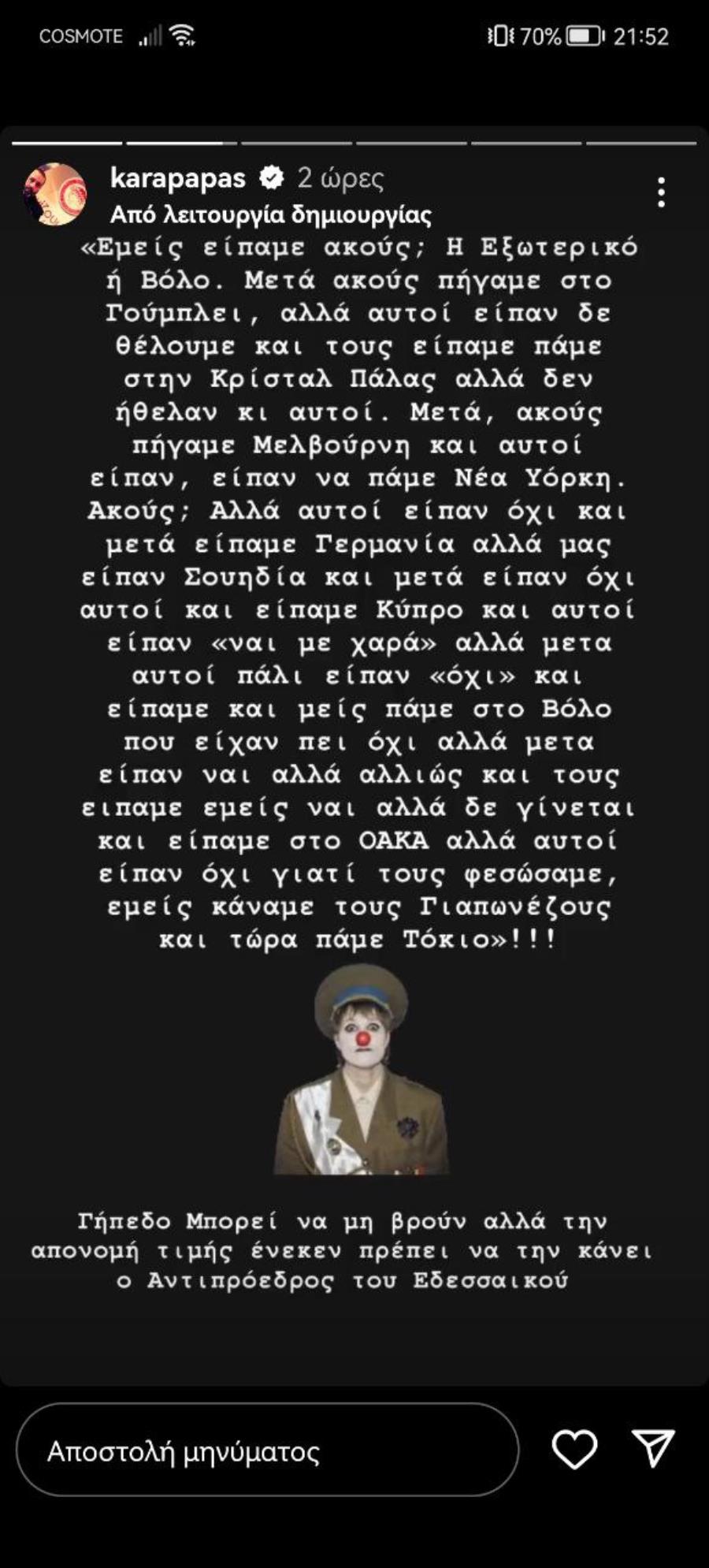 Κριτική στην ΕΠΟ με αφορμή το μπάχαλο που επικρατεί με την έδρα της διεξαγωγής του τελικού του Κυπέλλου ασκεί ο Κώστας Καραπάπας με ανάρτησή του στο instagram. Ο αντιπρόεδρος του Ολυμπιακού στην ανάρτησή του, η οποία θυμίζει αρκετά τον αντιπρόεδρο του Εδεσσαϊκού καταλήγει με νόημα… «και τώρα πάμε Τόκιο».