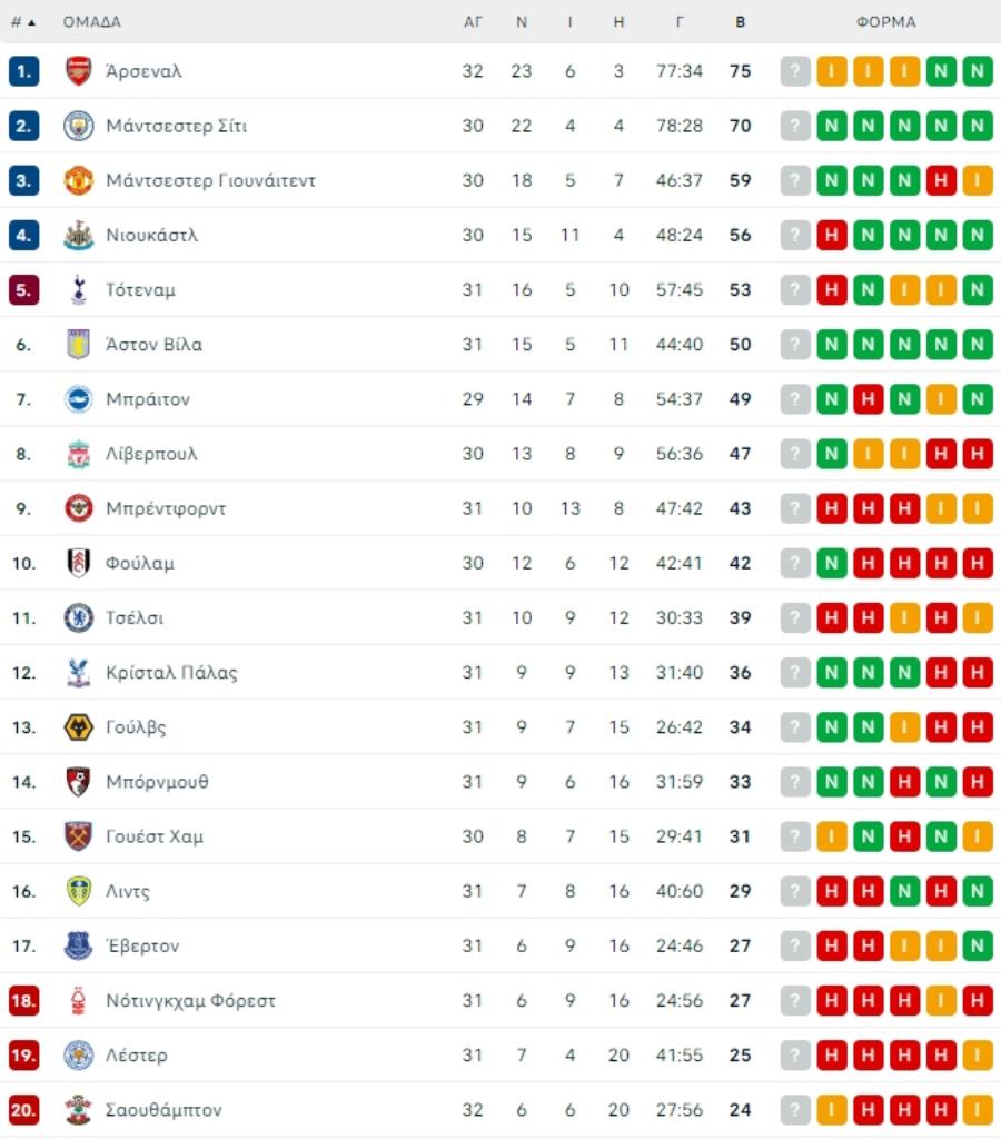 Και όλα αυτά, ενώ, η Μάντσεστερ Σίτι υποδέχεται σε τέσσερις ημέρες (26/04) τους «κανονιέρηδες» στο «Έτιχαντ» για την 33η αγωνιστική!