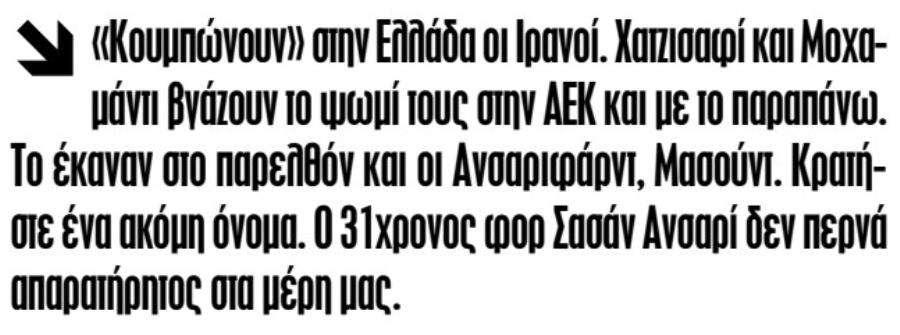 Το έκαναν στο παρελθόν και οι Ανσαριφάρντ, Μασούντ. Κρατήστε ένα ακόμη όνομα. Ο 31χρονος φορ Σασάν Ανσαρί δεν περνά απαρατήρητος στα μέρη μας» αναφέρει το δημοσίευμα.