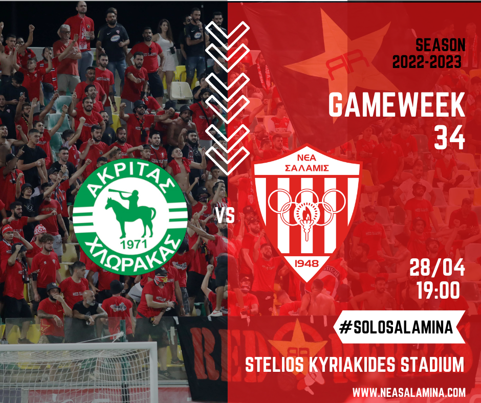 Το Διοικητικό Συμβούλιο της ΝΕΑΣ ΣΑΛΑΜΙΝΑΣ ΑΜΜΟΧΩΣΤΟΥ ενημερώνει για τις λεπτομέρειες του αγώνα της 8ης Αγωνιστικής της Β’ φάση του πρωταθλήματος, με αντίπαλο τον Ακρίτα Χλώρακας, που είναι ορισμένος την Παρασκευή 28 Απριλίου στις 19:00, στο στάδιο «Στέλιος Κυριακίδης».