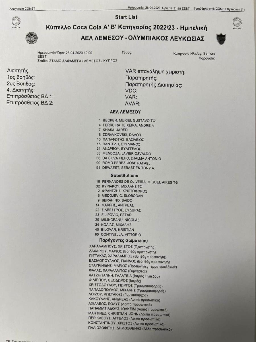 ΑΕΛ (Χαραλάμπους): Μούριελ, Παντελή, Τεϊσέιρα, Ντέγοεστ, Τζαλμά, Ζντραβκόφσκι, Ανδρέου (86΄ Κολιάς), Παπαφώτης (64΄ Μεντόγεβιτς), Ρομό (64΄ Μιλιντσεάνου), Μεντόζα, Χάσα (64΄ Μακρής).