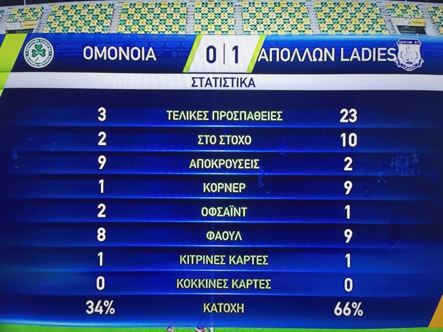 Η Απόλλων Ladies κυριάρχησε από τα πρώτα λεπτά και στο 19ο λεπτό άνοιξε το σκορ με πανέμορφο πλασέ της Φρέντα από αριστερά μέσα στην περιοχή.