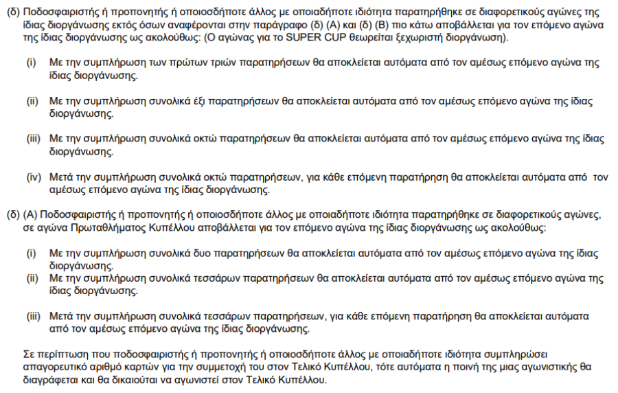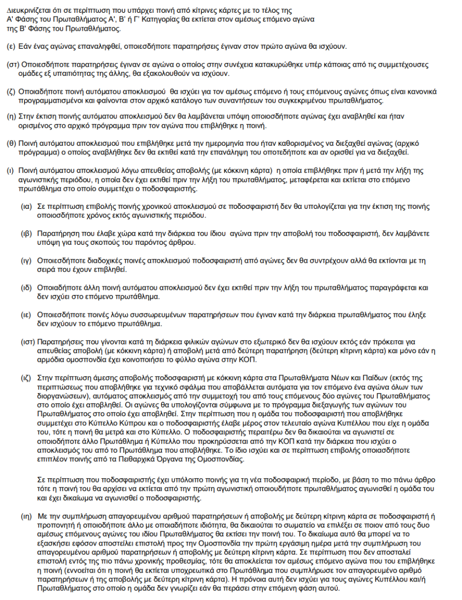 -Στη Β΄ φάση του Πρωταθλήματος, ποδοσφαιριστής αποκλείεται από τον επόμενο αγώνα της ομάδας του όταν συμπληρώσει τρεις κίτρινες κάρτες, έξι κίτρινες κάρτες και οκτώ κίτρινες κάρτες.