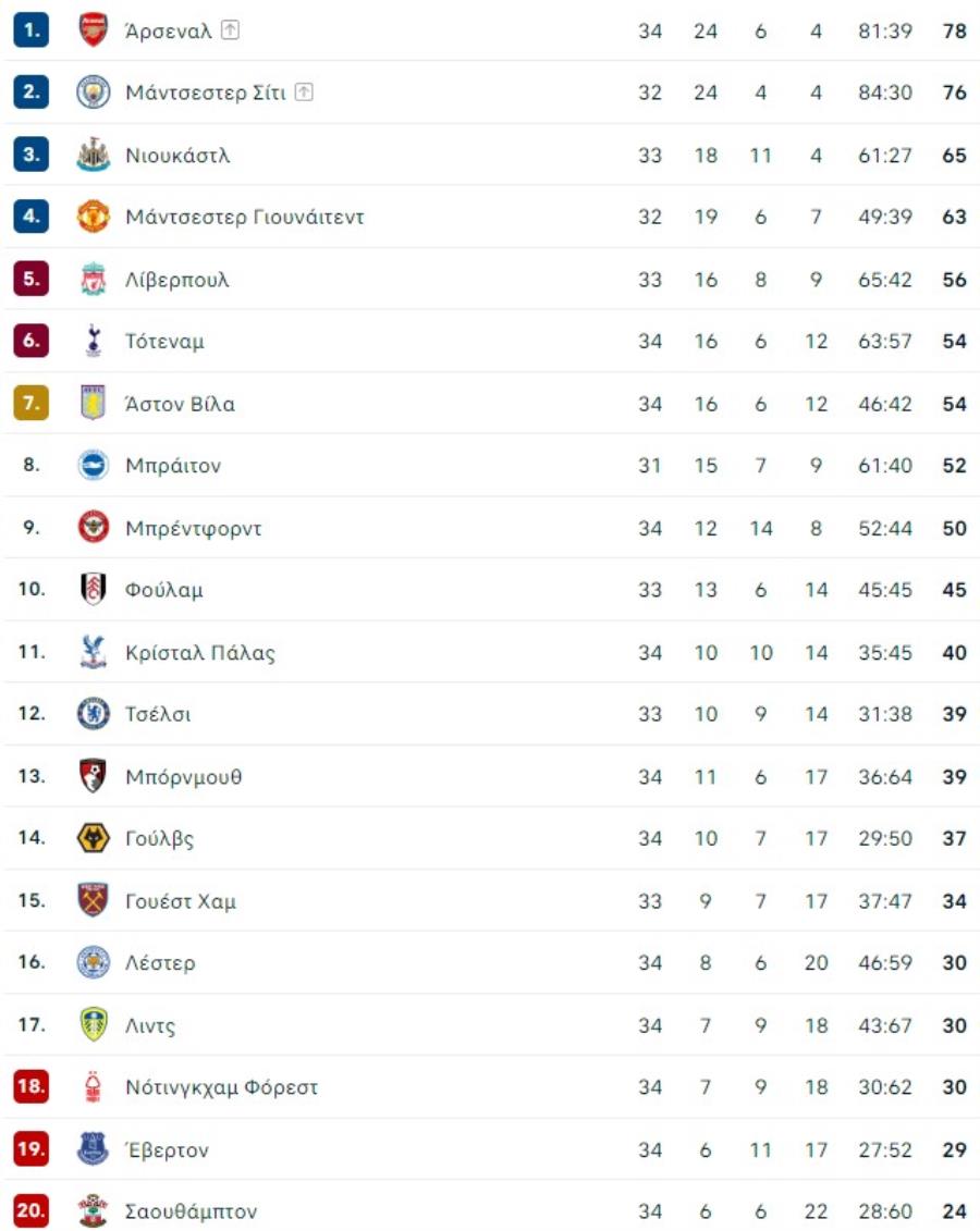 Έτσι, η ομάδα του Μικέλ Αρτέτα βρέθηκε εκ νέου στην κορυφή και στο +2 από εκείνη του Πεπ Γκουαρδιόλα, η οποία βέβαια έχει και δύο αγώνες λιγότερους. Από την άλλη, η Τσέλσι ηττήθηκε για τέταρτο σερί ματς!