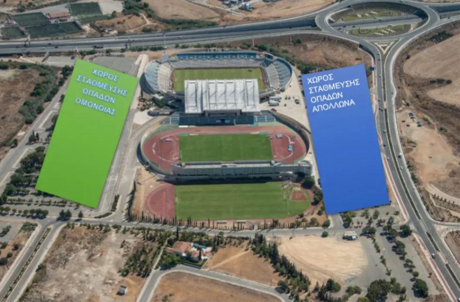 Οι φίλαθλοι της ΟΜΟΝΟΙΑΣ θα καταλάβουν τις Δυτικές, Βόρειες και Ανατολικές κερκίδες του Σταδίου, ως εκ τούτου, προτρέπονται να κατευθυνθούν στο Στάδιο μέσω της Λεωφόρου Ανεξαρτησίας και του κυκλικού κόμβου του Γ.Σ.Π.. Να σταθμεύσουν τα οχήματα τους στον Δυτικό και στον Βόρειο χώρο στάθμευσης οχημάτων.