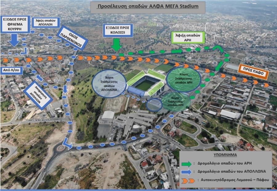 Για την ομαλή προσέλευση και αποχώρηση τους προς και από το στάδιο, οι οπαδοί του ΑΠΟΛΛΩΝΑ καλούνται να κατευθυνθούν προς το ΑΛΦΑΜΕΓΑ Stadium, δια μέσου του αυτοκινητόδρομου {Α6} προς Πάφο, της εξόδου προς το φράγμα Κούρρη και στη συνέχεια μέσω της οδού Παρθενώνος (1ο στρίψιμο δεξιά). Ακολούθως από την 1η έξοδο {αριστερά} του νέου κυκλικού κόμβου, να κατευθυνθούν προς το στάδιο. Οι φίλαθλοι του ΑΠΟΛΛΩΝΑ μπορούν να σταθμεύσουν το όχημά τους στους προκαθορισμένους χώρους του σταδίου για τους φιλοξενούμενους.