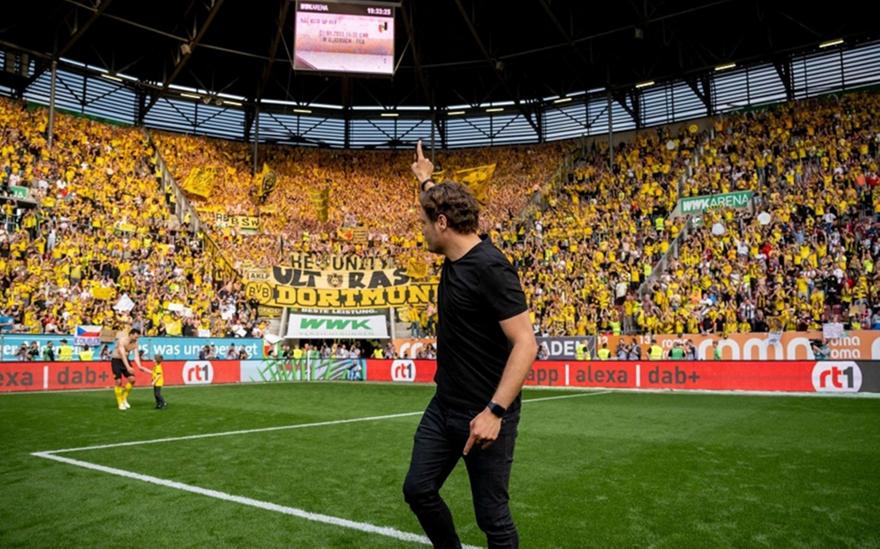 Themasports teamΗ Ντόρτμουντ πέρασε από την έδρα της Άουγκσμπουργκ και αγκαλιάζει τον τίτλο, με παίκτες και κόσμο να γίνονται ένα στο φινάλε και να τραγουδάνε παρέα.