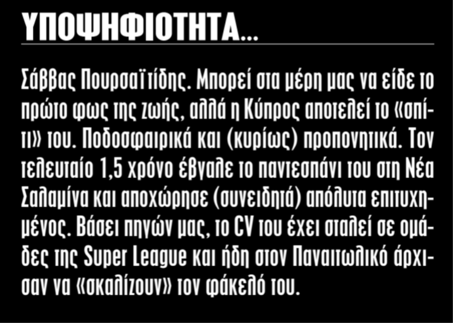 Σύμφωνα με σημερινό (27/05) παρασκηνιακό δημοσίευμα της ελλαδικής αθλητικής εφημερίδας «Sportime», το βιογραφικό του Ελλαδίτη προπονητή, Σάββα Πουρσαϊτίδη, στάλθηκε σε ομάδες της Super League και όπως επισημαίνεται, στον Παναιτωλικό άρχισαν ήδη να... «σκαλίζουν» τον φάκελο του!