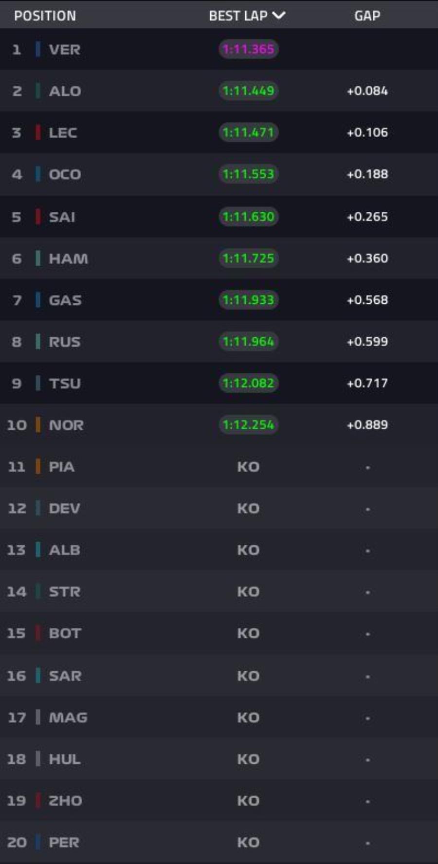Την πεντάδα συμπλήρωσαν οι Οκόν και Σάινθ, ενώ έκτος θα εκκινήσει ο Λιούις Χάμιλτον, έβδομος ο Πιέρ Γκασλί, όγδοος ο Ράσελ, ένατος ο Τσουνόντα και δέκατος ο Λάντο Νόρις.