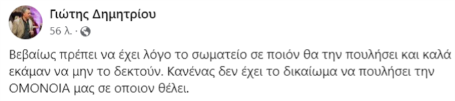 «Βεβαίως πρέπει να έχει λόγο το Σωματείο σε ποιον θα την πουλήσει και καλά εκάμαν να μην το δεχτούν. Κανένας δεν έχει το δικαίωμα να πουλήσει την Ομόνοια μας σε όποιον θέλει».