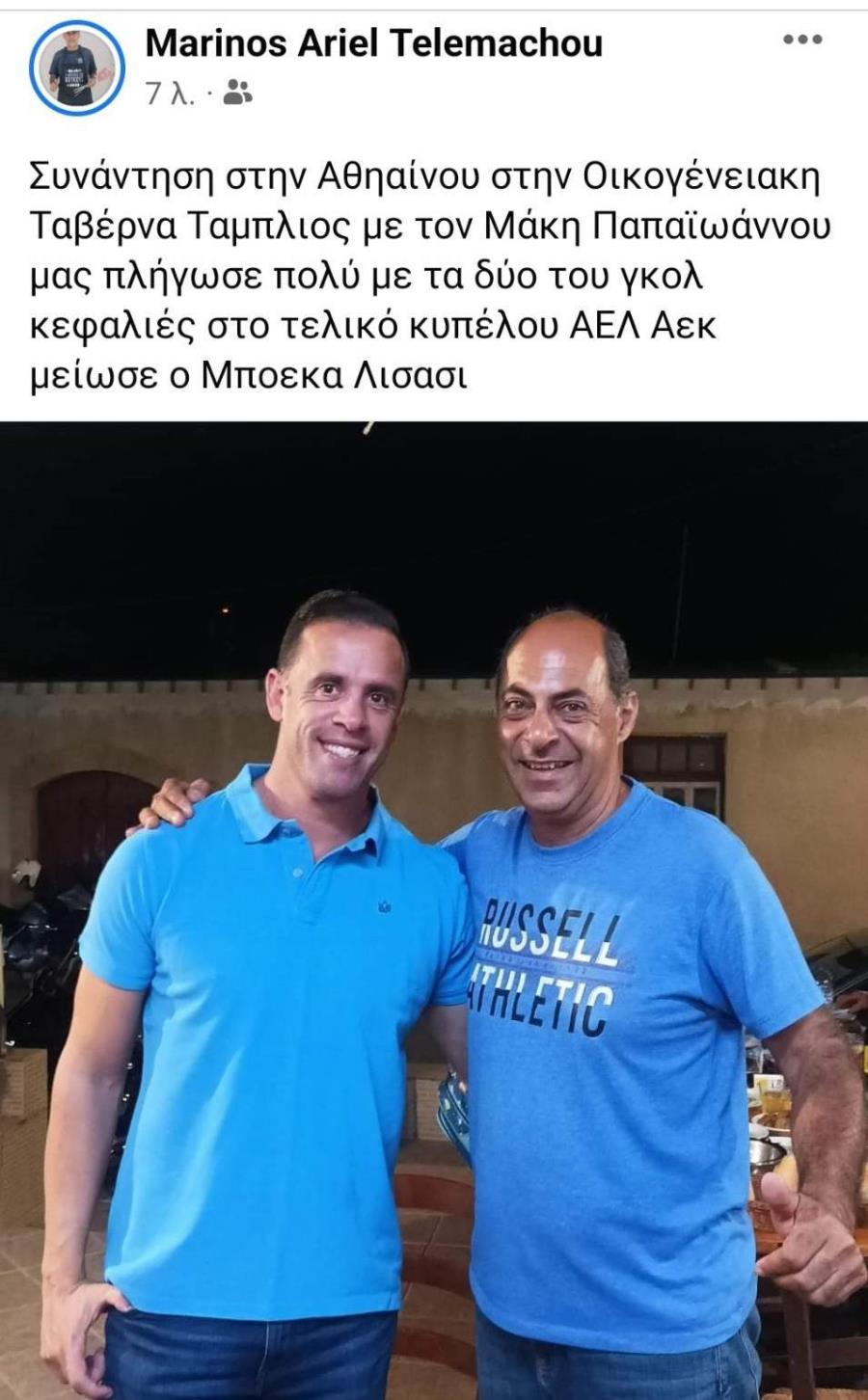 Ο γνωστός φίλαθλος της ΑΕΛ, Μαρίνος Τηλέμαχου, ανάρτησε φωτογραφία με τον Μάκη Παπαϊωάννου. Ο πρώην τεχνικός διευθυντής της Νέας Σαλαμίνας, ανακοινώθηκε πρόσφατα από τον Απόλλωνα για το πόστο του Αθλητικού Διευθυντή.
