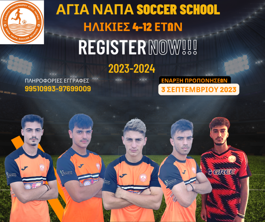 Τo Aγία Νάπα Soccer School καλεί όλους τους νέους ποδοσφαιριστές της ευρύτερης περιοχής Αμμοχώστου που θέλουν να μάθουν τα μυστικά του ποδοσφαίρου, να πλαισιώσουν την μεγάλη οικογένεια του και να αγωνιστούν όχι μόνο στα grassroots, αλλά και στην ΑΝΩΤΑΤΗ ΚΑΤΗΓΟΡΙΑ της ΚΟΠ και στις ηλικίες Κ-14,Κ-15,Κ16,Κ17.