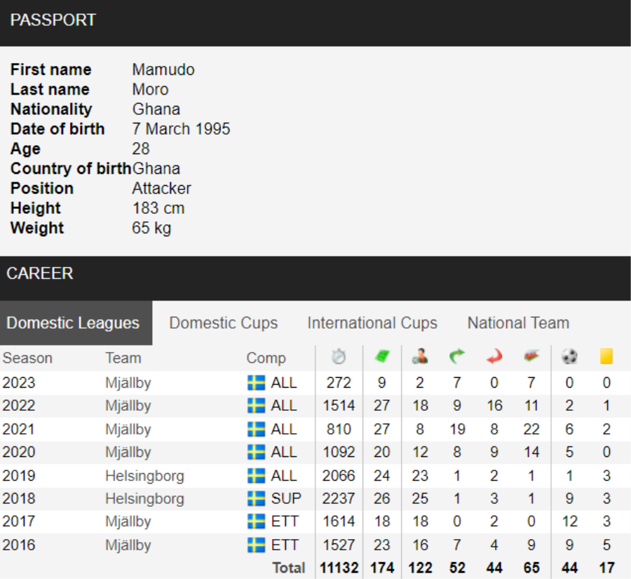 Ο Μόρο αγωνίζεται στα δύο άκρα της επίθεσης, ενώ την τρέχουσα σεζόν κατέγραψε 14 συμμετοχές, 2 γκολ και 1 ασίστ στο πρωτάθλημα Σουηδίας.