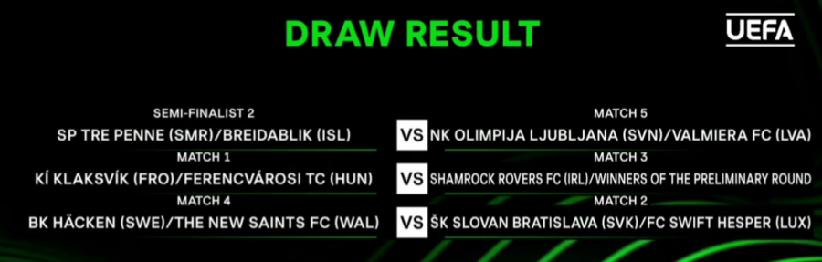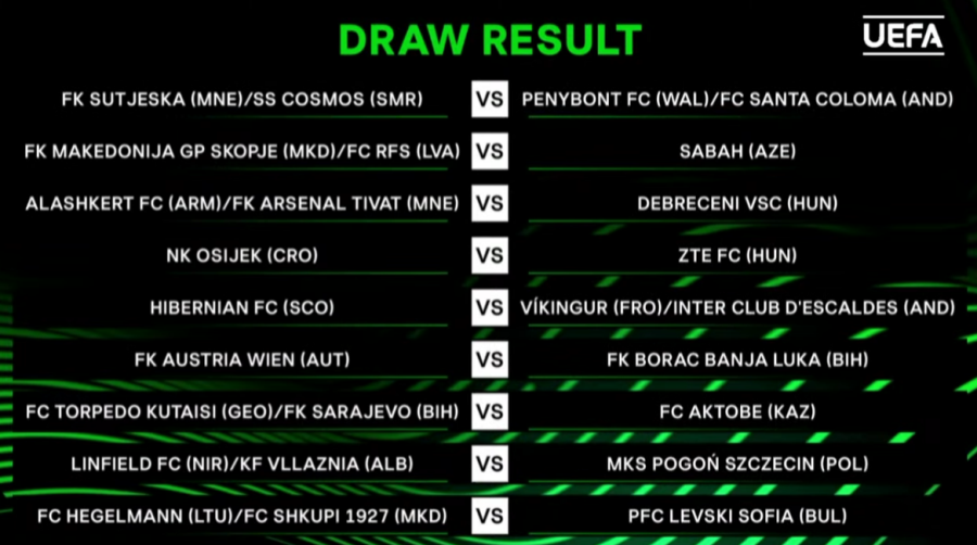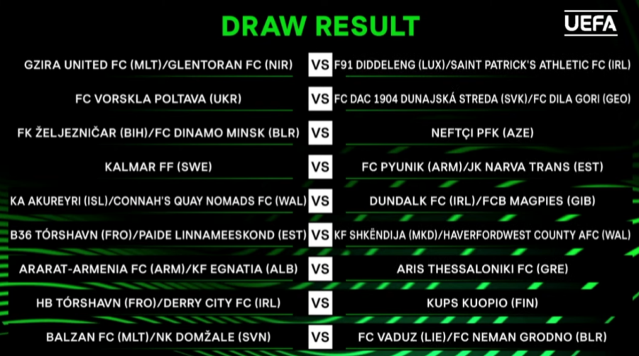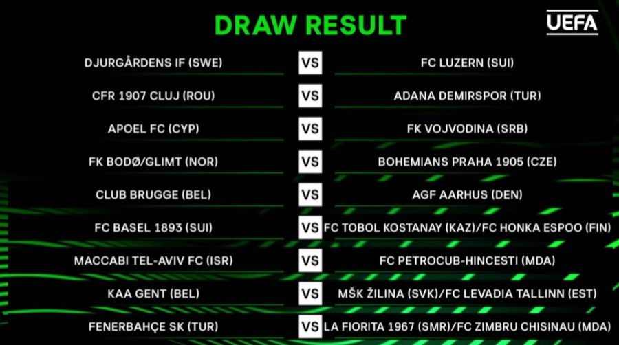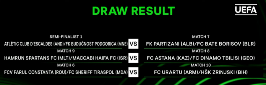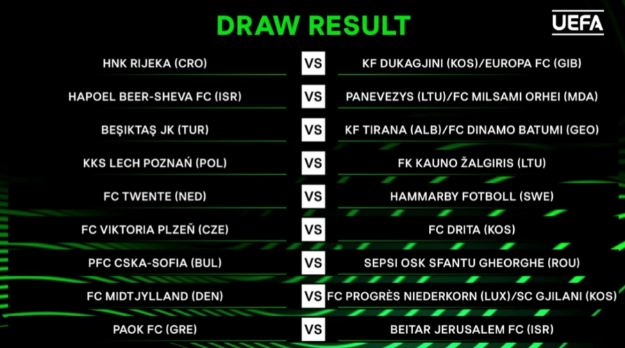 Από Ελλαδικής πλευράς, ο ΠΑΟΚ κληρώθηκε να αγωνιστεί με την Μπεϊτάρ Ιερουσαλήμ, ενώ ο Άρης θα αντιμετωπίσει τον νικητή του ζευγαριού ανάμεσα στην Αραράτ και την Εγνατία.