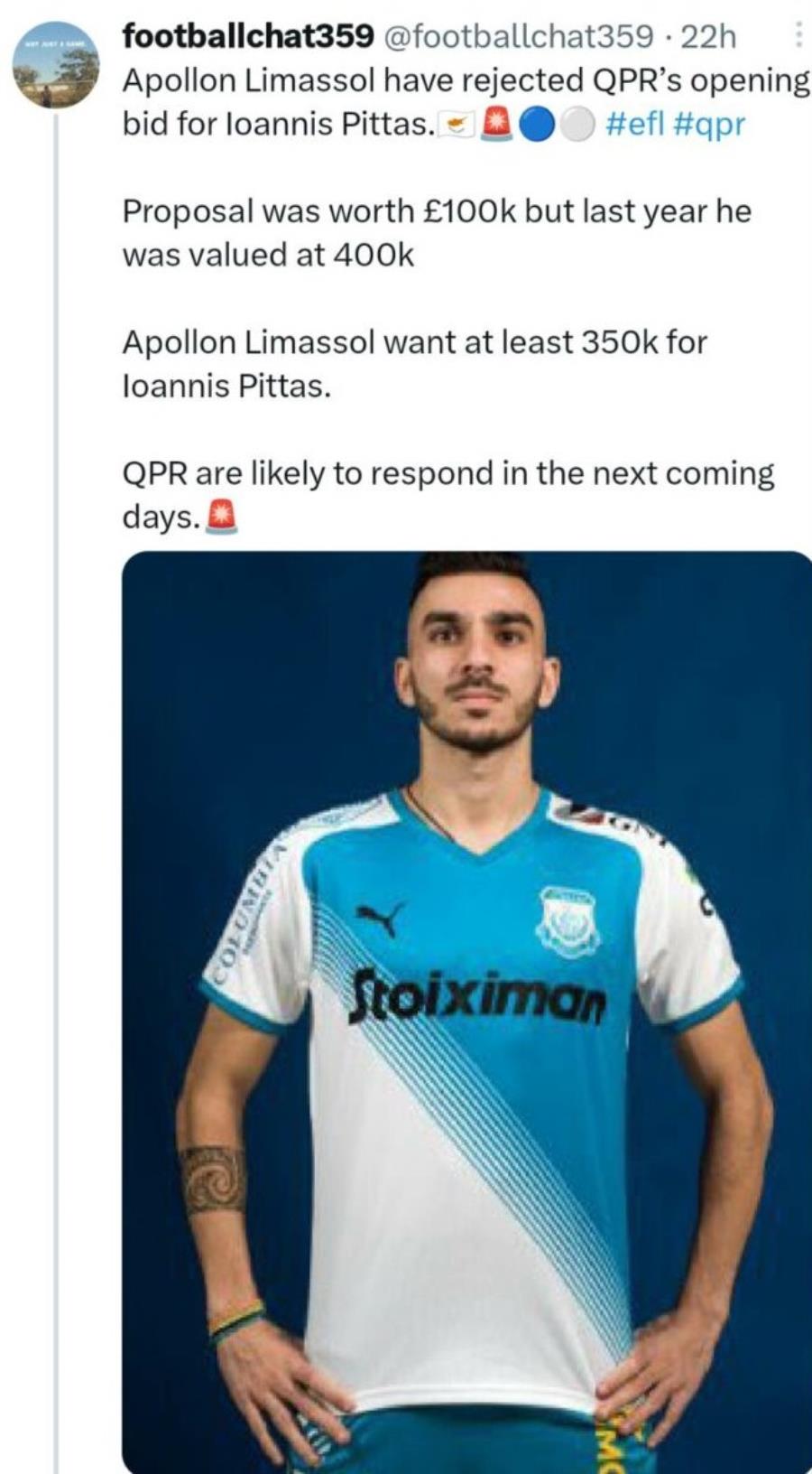 Σύμφωνα με όσα αναφέρονται η ΚΠΡ έκανε πρόταση για 100 χιλιάδες λίρες και ο Απόλλωνας ζητάει τουλάχιστον 350 χιλ. και ότι η αγγλική ομάδα θα... επανέλθει.