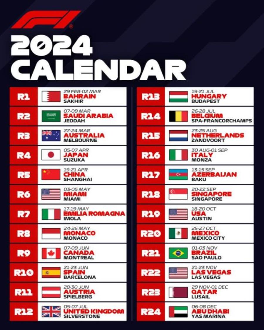 Αυτό θα περιλαμβάνει 24 Γκραν Πρι, ξεκινώντας από το Μπαχρέιν στις 2 Μαρτίου και καταλήγοντας στο Αμπού Ντάμπι στις 8 Δεκεμβρίου του 2024.