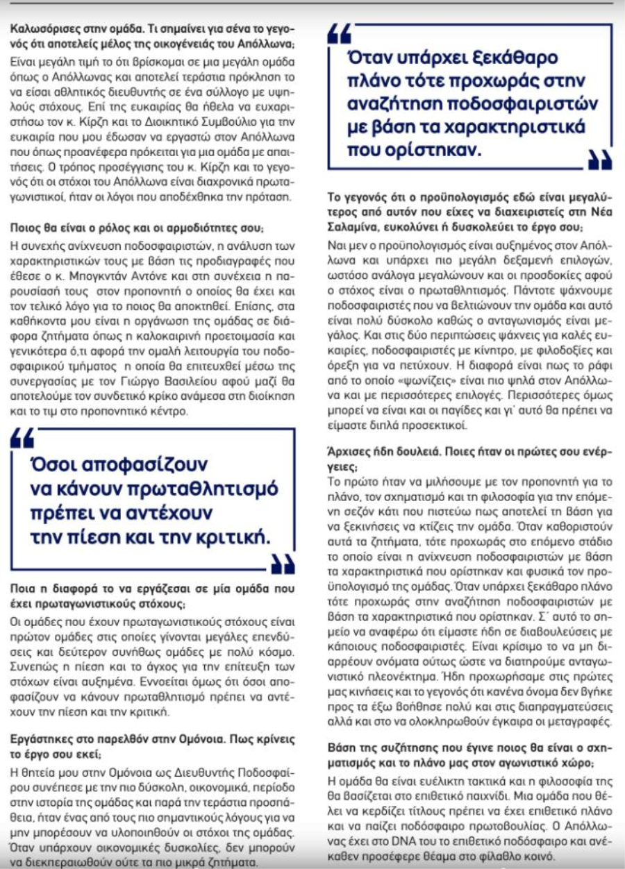 Επί της ευκαιρίας θα ήθελα να ευχαριστήσω τον κ. Κίρζη και το Διοικητικό Συμβούλιο για την ευκαιρία που μου έδωσαν να εργαστώ στον Απόλλωνα που όπως προανέφερα πρόκειται για μια ομάδα με απαιτήσεις.