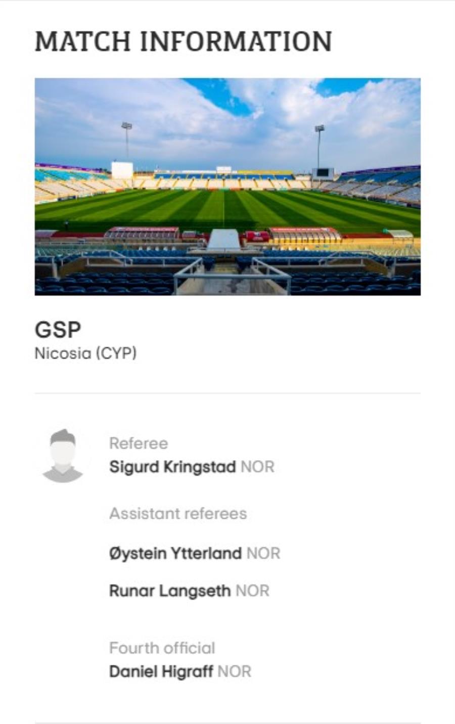 Άρχοντας της αναμέτρησης θα είναι ο Sigurd Kringstad, με βοηθούς τους Øystein Ytterland, Runar Langseth και τέταρτος ο Daniel Higraff.