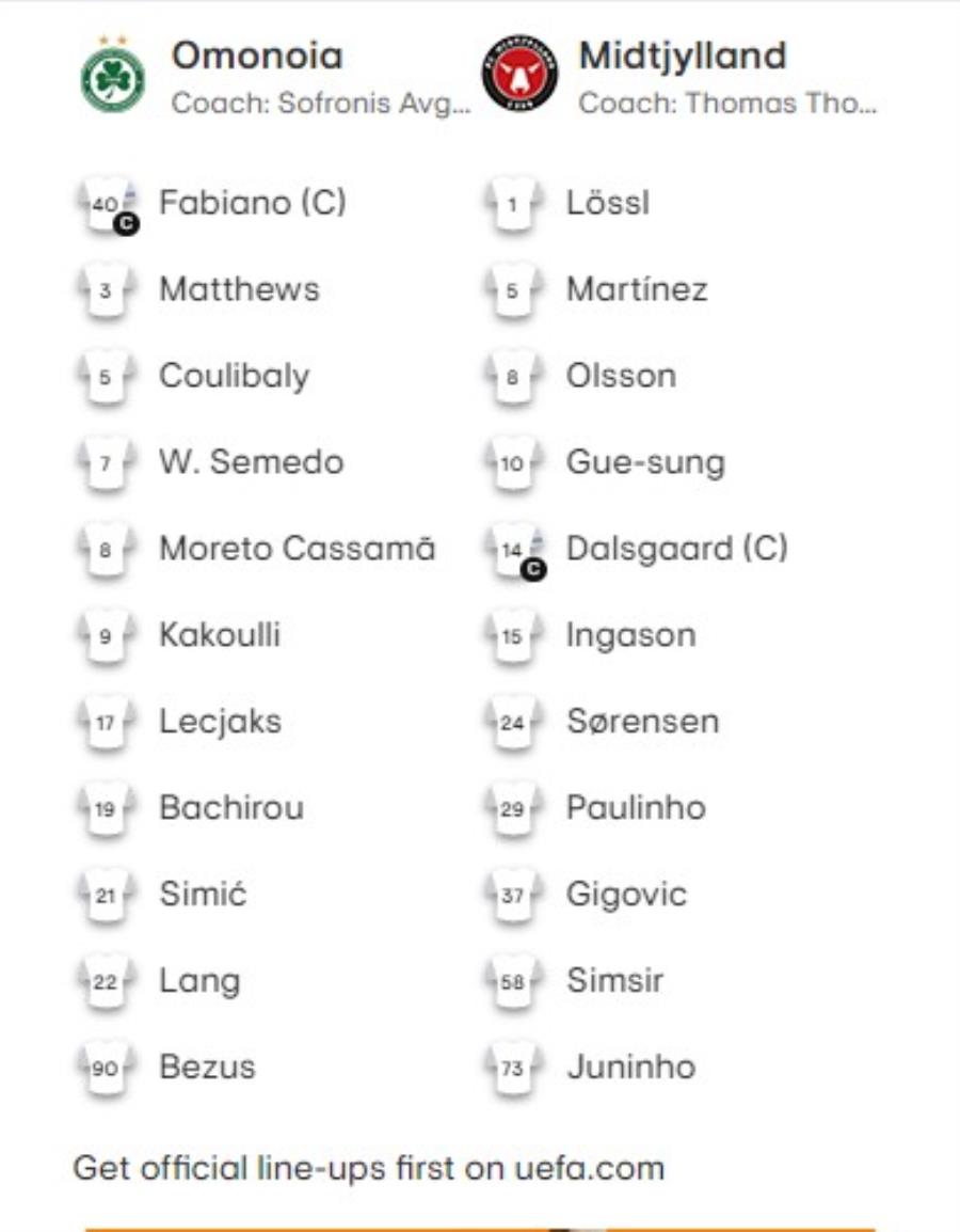Themasports teamΗ αρχική ενδεκάδα της Ομόνοιας για τον αποψινό αγώνα κόντρα στην Μίντζιλαντ.