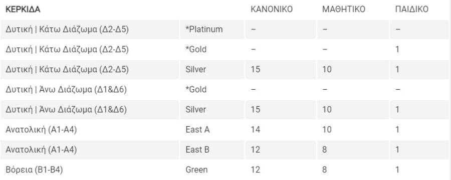 – Κανονικό: 20+ χρόνων – Μαθητικό: 14-20 χρόνων – Παιδικό: κάτω των 14 χρόνων