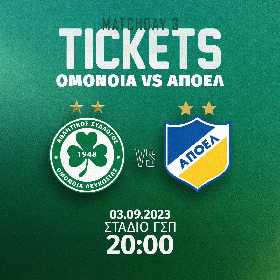 Από τη Δευτέρα, 28 Αυγούστου, στις 14:00, διατίθενται τα εισιτήρια του αγώνα με τον ΑΠΟΕΛ, ο οποίος θα διεξαχθεί την Κυριακή, 3 Σεπτεμβρίου, στο Στάδιο ΓΣΠ και θα αρχίσει στις 20:00, στο πλαίσιο της 3ης αγωνιστικής του πρωταθλήματος.
